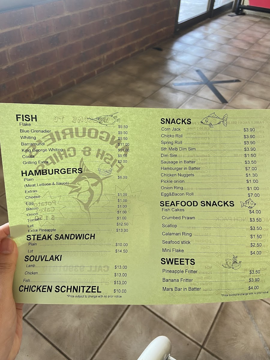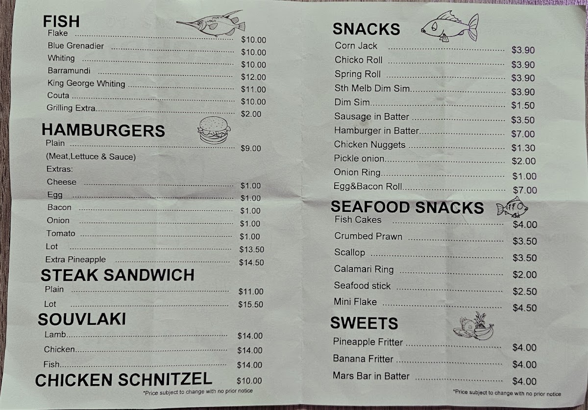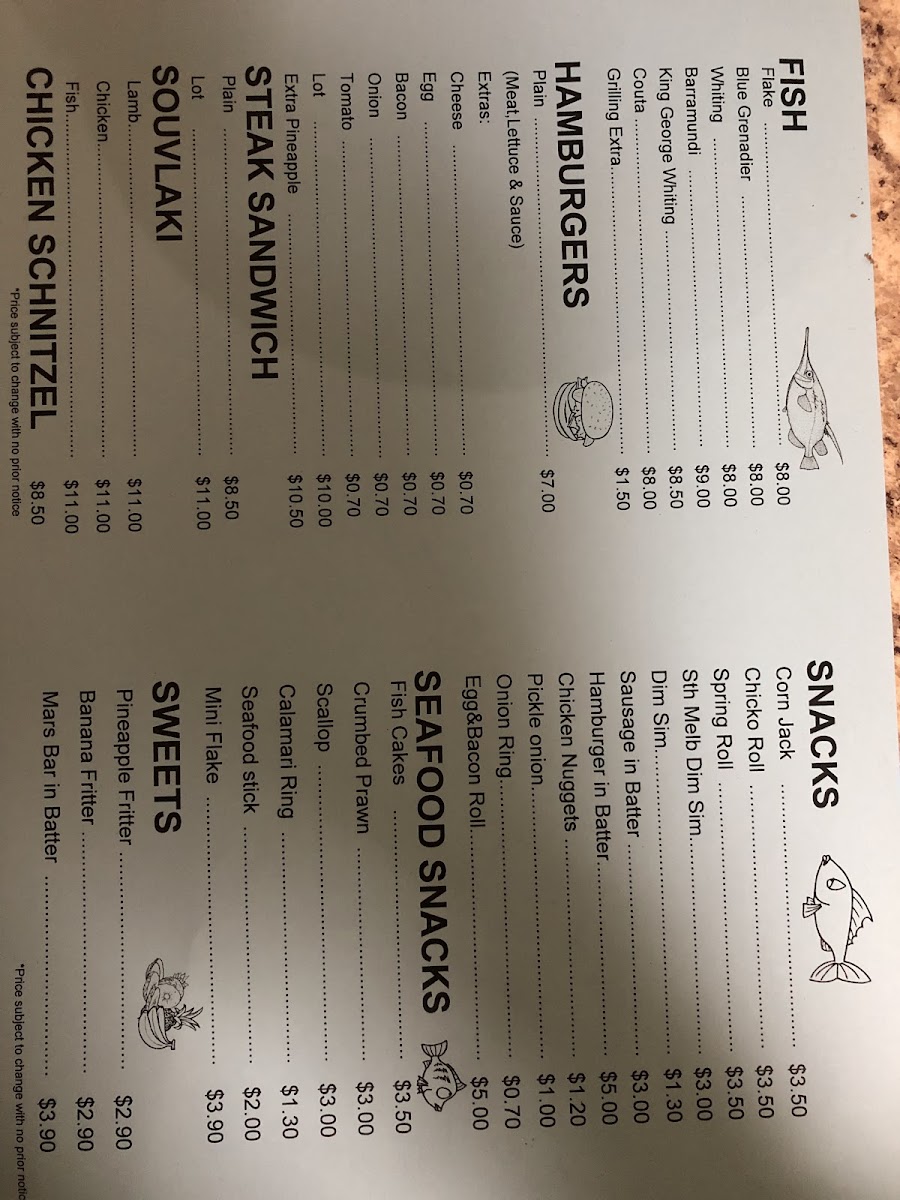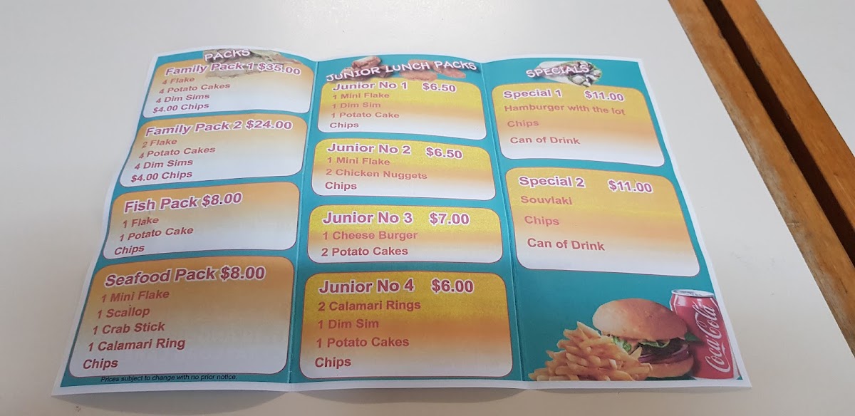 Overall, the menu at Angourie Cresent Fish And Chips offers a well-rounded selection that captures the essence of a classic takeaway experience, with a strong focus on variety and comfort. The fish options, including Flake, Blue Grenadier, Whiting, Barramundi, and King George Whiting, provide plenty of choice for seafood lovers, while the snack section features familiar favorites like Corn Jack, Chicko Roll, Spring Roll, Sth Melb Dim Sim, and Dim Sim. The seafood snack range, such as Crumbed Prawn, Scallop, Calamari Ring, Seafood Stick, and Mini Flake, adds extra depth for those wanting smaller bites. For something sweet, options like Pineapple Fritter, Banana Fritter, and Mars Bar In Batter round out the meal nicely. The inclusion of Lamb and Chicken souvlaki broadens the menu beyond traditional fish and chips, while convenient choices like Junior No 1, Junior No 2, Junior No 3, and Junior No 4 cater well to kids. Finally, larger options such as the Family Pack 1, Fish Pack, and Seafood Pack make it easy to share, making the menu both versatile and satisfying for a wide range of customers.