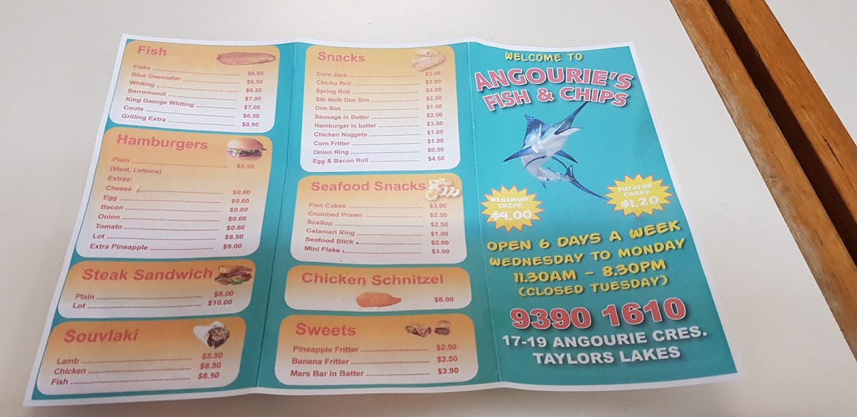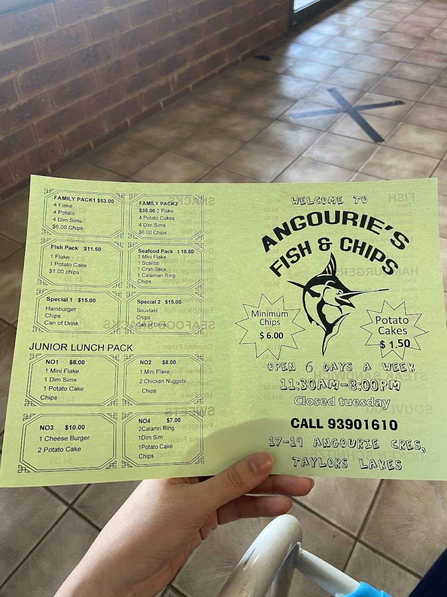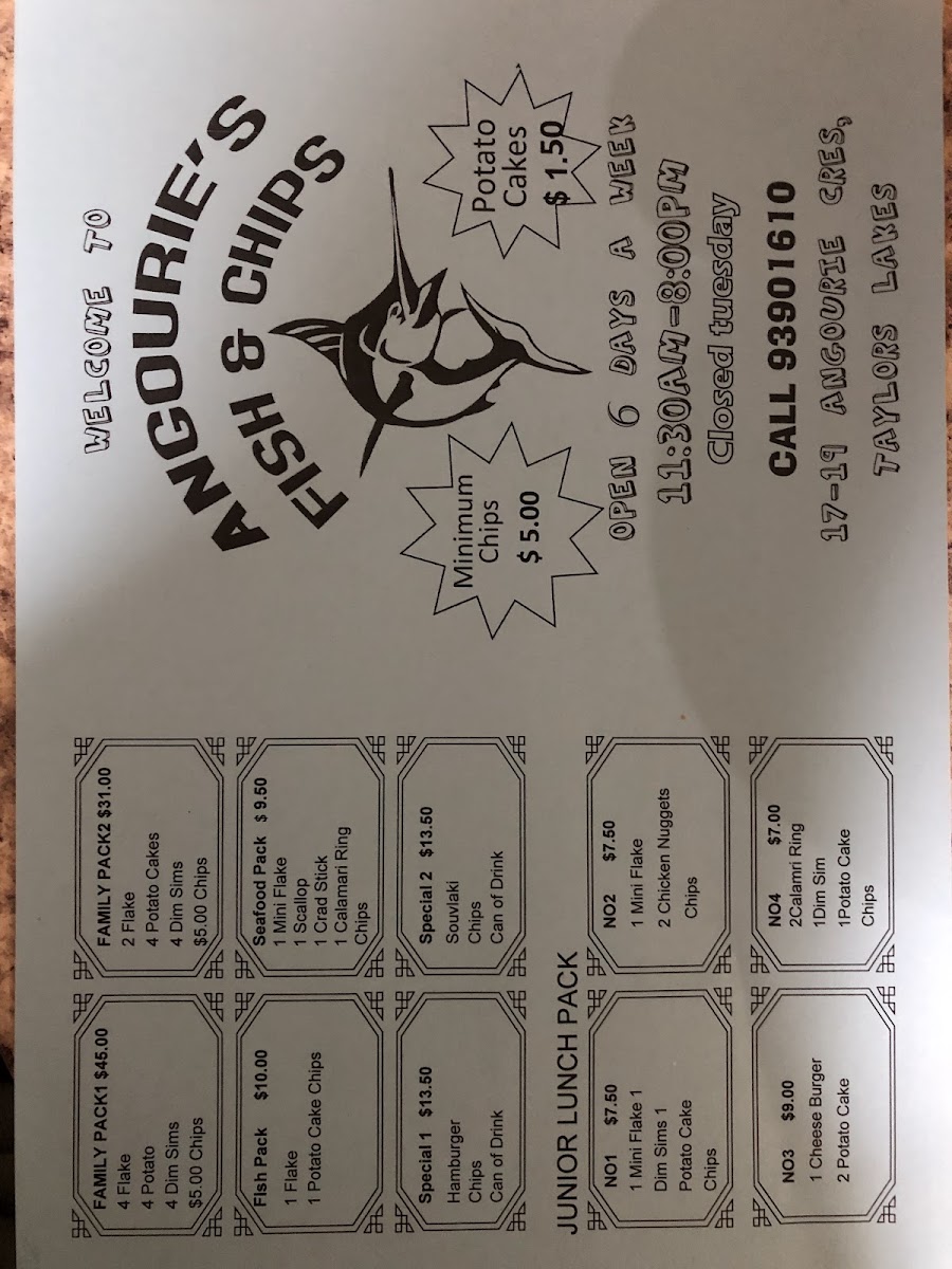 Overall, the menu at Angourie Cresent Fish And Chips offers a well-rounded selection that captures the essence of a classic takeaway experience, with a strong focus on variety and comfort. The fish options, including Flake, Blue Grenadier, Whiting, Barramundi, and King George Whiting, provide plenty of choice for seafood lovers, while the snack section features familiar favorites like Corn Jack, Chicko Roll, Spring Roll, Sth Melb Dim Sim, and Dim Sim. The seafood snack range, such as Crumbed Prawn, Scallop, Calamari Ring, Seafood Stick, and Mini Flake, adds extra depth for those wanting smaller bites. For something sweet, options like Pineapple Fritter, Banana Fritter, and Mars Bar In Batter round out the meal nicely. The inclusion of Lamb and Chicken souvlaki broadens the menu beyond traditional fish and chips, while convenient choices like Junior No 1, Junior No 2, Junior No 3, and Junior No 4 cater well to kids. Finally, larger options such as the Family Pack 1, Fish Pack, and Seafood Pack make it easy to share, making the menu both versatile and satisfying for a wide range of customers.